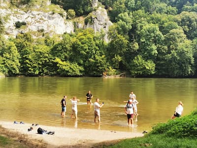 Wieder gestärkt und mit vollem Magen tankten wir dann gegen Abend noch ein paar Sonnenstrahlen am Ufer vor dem Kloster. Der ein oder andere konnte hierbei einem kleinen Nickerchen nicht widerstehen, während wir auf die Fähre warteten. Die 20-minütige Fahrt mit der Fähre auf der Donau zeigte uns erneut die Schönheit unserer Landschaft und bildete den perfekten Abschluss unserer Wanderung.